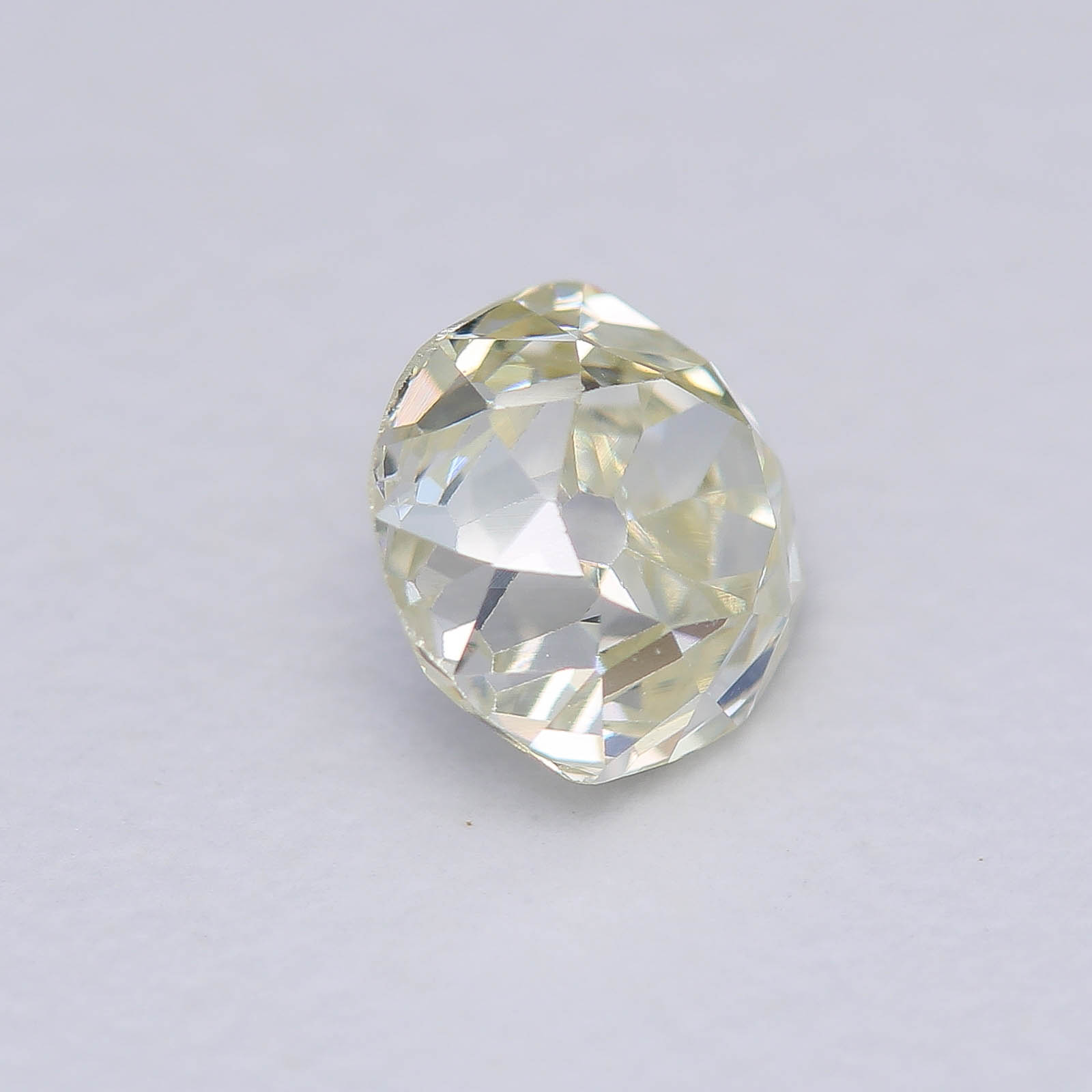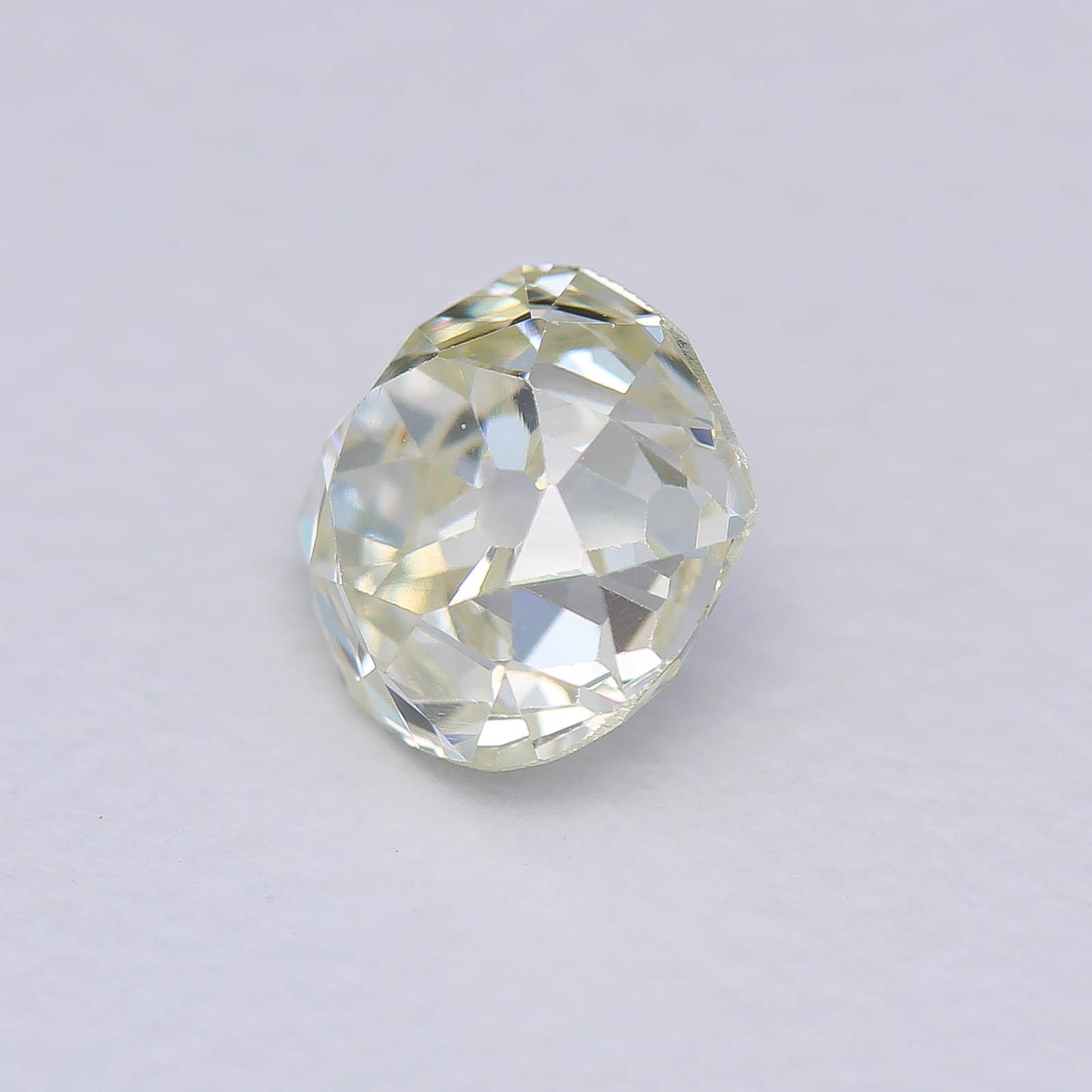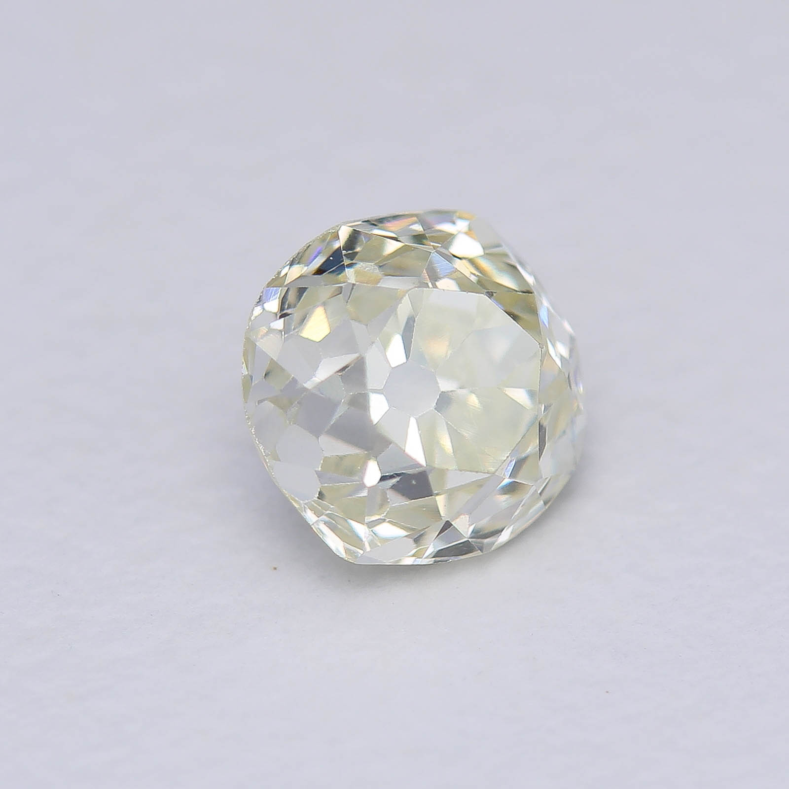 Wonky and Elegant are the first adjectives that come to mind... Very towering proportions on this oldie, typical of late 18th century cutting styles. Large pops of light and a pleasant shape help mask the warmer bodycolor of this diamond.