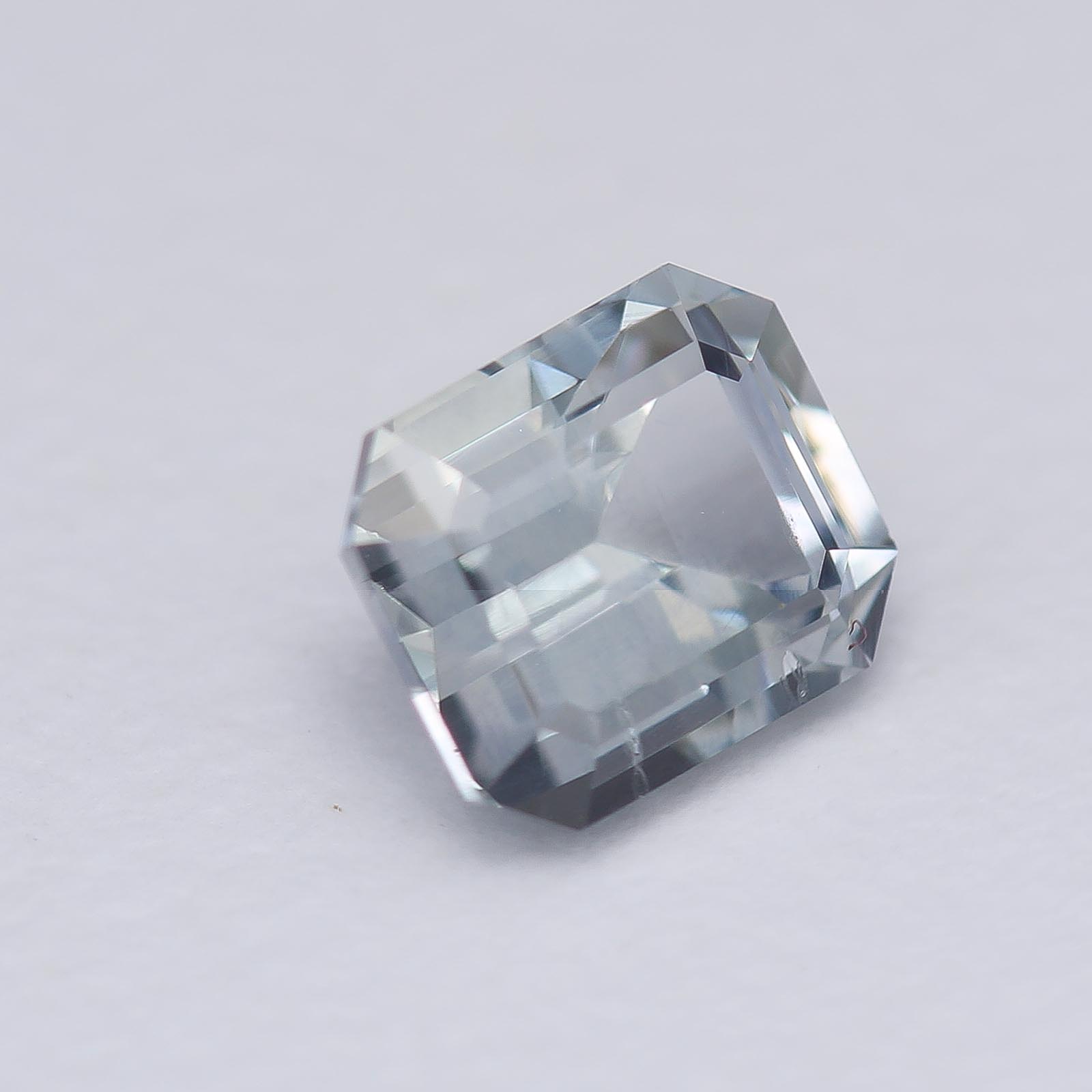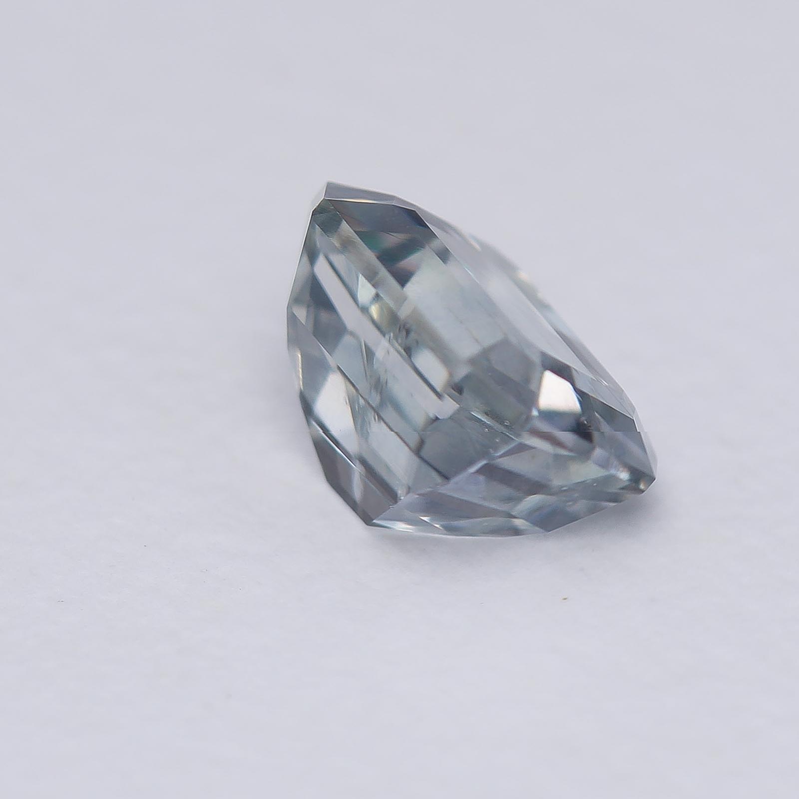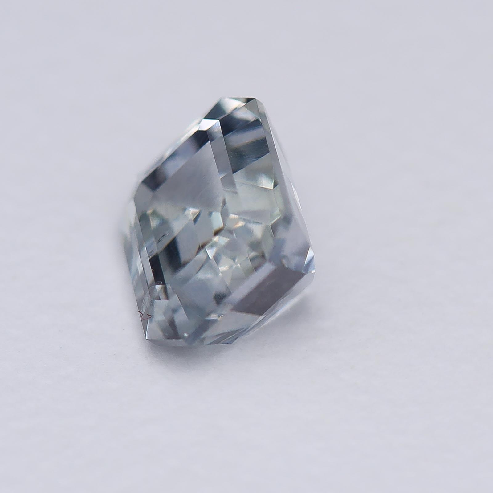Bodycolor is light blue with strong gray undertones in fluorescent light with slight shift to pale violet in daylight and incandescent light. Super clean and crisp sapphire!