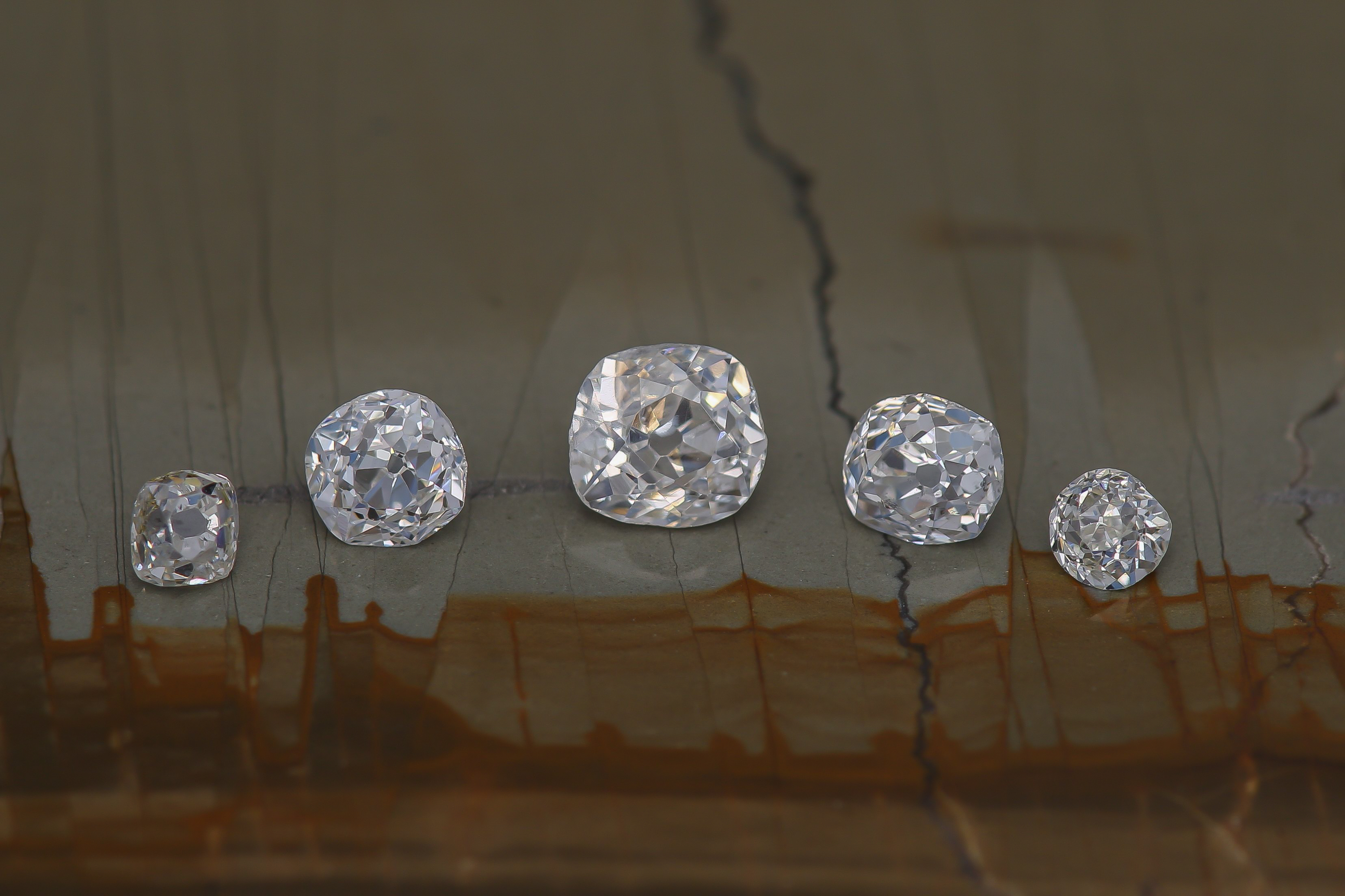 Full-cut brilliants (cutter's lingo: "triple cuts"), with the same number of facets as a modern round brilliant, first appeared at the end of the 17th century. Most Old Mine Cuts -and its later variations one can find, were cut between 1800 and the 1890s. They can have any outline, as the natural rough shape was often followed. Large or very large culets are typical just as tall crowns and deep pavilions.